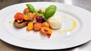 Bruschetta „à la Humann“ In Butter knusprig geröstetes Bauernbrot an Salat von bunten Kirschtomaten, roten Zwiebelchen und Passionsfrucht mit Büffelmilch-Burrata, frischem Basilikum und feiner Vinaigrette von Piment d`Espelette, Orange und Olivenöl