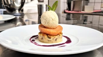 Die allererste auf dem Mond verspeiste Frucht, war ein Pfirsich. Pfirsich, Brioche und Vanille In sommerlich duftigem Gewürzsud sanft gegarter Weinbergpfirsich auf saftigem Briocheflan mit selbstgemachtem Brioche-Vanilleeis und fruchtiger Weinbergpfirsichsauce