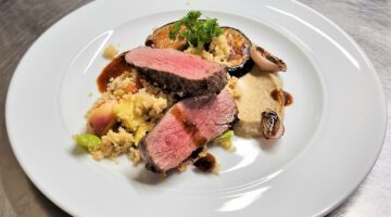 Rosa gebratener Damhirschrücken an würziger Pfeffer-Dattelsauce, auf ofengerösteter Aubergine, Baba Ganoush und orientalisch gewürzter Couscous mit Weinbergpfirsich, Zucchini, Berberitze, Kichererbse, Favabohne und karamellisierter Schalotte