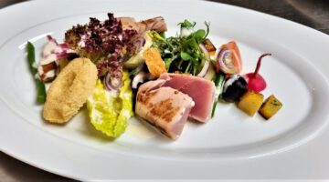 Salade Niçoise „à la Humann“ Knackige Blattsalate, Tomaten, Kartoffelwürfelchen, Gurken, Paprika Artischocken, schwarzen Oliven, Wachteleiern, Croûtons und grünen Bohnen an mildem Knoblauch-Dressing und frischem Thunfisch