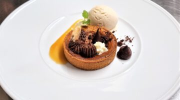 Toffifée „à la Humann“ Feine Karamell-Tarte mit Crème von dunkler Schokolade, mit selbstgemachtem Haselnußeis auf Karamellgel leichter Gianduja-Nougatmousse und knusprige Haselnußstreusel