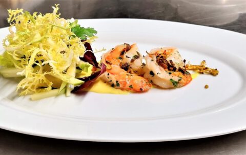 Gebratene Black Tiger-Garnelen „à la Humann“ auf feiner Safrancrème an kleinem Salat von Granny Smith,...