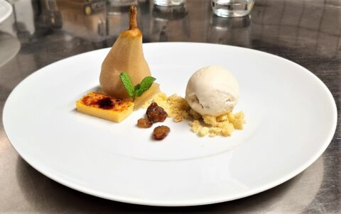 Birnentarte „à la Humann“ In mildem Gewürzsud pochierte Birne auf feinem Birnengelée mit knusprigen...