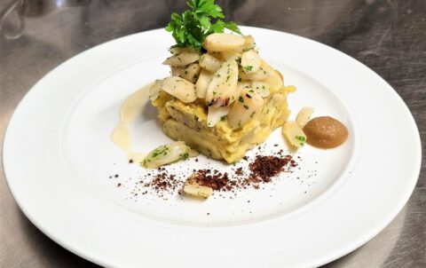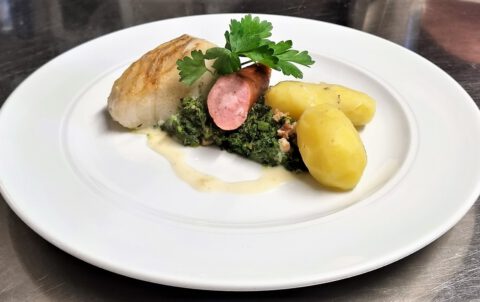 Grünkohl mit Pinkel „à la Humann“ Gebratenes Filet vom Grönland Kabeljau an feiner Weißwein - Buttersauce...
