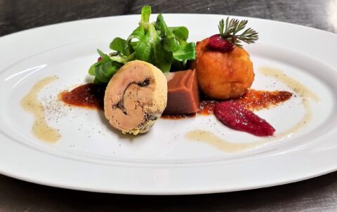 Berliner, Leber und Quitte „à la Humann“ Feine Terrine von Entenleber und Kakao und Berliner gefüllt...