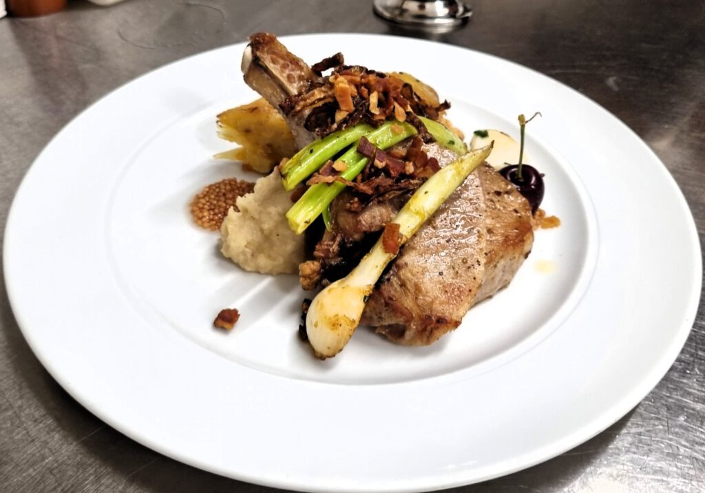 an aromatischer Sauce von Kirschen, Sternanis und Balsamessig mit eingelegter Senfsaat